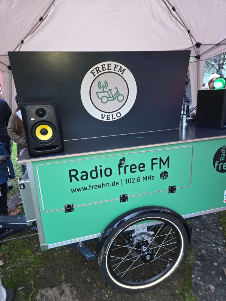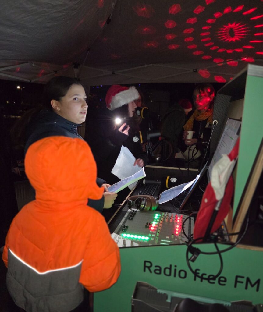 Am 5. Dezember 2025 waren alle umliegenden Schulen vom Team des Quartiersmanagement Neu-Ulm eingeladen, am Weihnachtsgeschichten Schul-Wettbewerb teilzunehmen. Unsere Schülerin Mia Liebhard aus der Klasse 5a reichte mit Hilfe ihrer Deutschlehrerin Frau Leuze ihre selbst geschriebene und selbst ausgedachte Geschichte beim Radiosender Radio free FM ein und wurde ausgewählt, ihren Text live in der Radiosendung am 5. Dezember vorzulesen. Beim Festplatz im Neu-Ulmer Vorfeld in der Steubenstraße 15 wartete ein zu einem kleinen Studio umgebautes Lastenfahrrad auf die Vortragenden. Ausgeschenkt an Paulas Plauderbar wurden Punsch, Glühwein und Plätzchen. Schon während des Radioworkshops stieg die Nervosität der teilnehmenden Schülerinnen und Schüler immer mehr. Jedes Kind durfte sich einen weihnachtlichen Song aus dem umfangreichen Angebot des Radiosenders aussuchen.