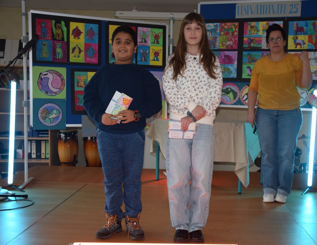 In den letzten Wochen haben die Schüler und Schülerinnen in ihren Klassen ihre Lesekünste unter Beweis gestellt und einen Klassenlesesieger/innen gekürt. Dabei ging es, neben dem möglichst fehlerfreien Lesen, auch um eine angemessene Betonung, die richtige Lautstärke und um die passende Vorlesegeschwindigkeit. Die dabei ermittelten Klassensieger/innen durften anschließend gegeneinander im Schulentscheid antreten: Die Jahrgansstufe 6 durfte dabei als Publikum dabei sein. Das Vorlesen bewertete nach vorgegebenen Kriterien eine fachkundige Jury bestehend aus Frau Kauder aus der Schulleitung, Frau Janota aus der Verwaltung, Amjad Idres als Vertreter der SMV und Herr Wölfle von Seiten des Elternbeirates. Eine objektive Bewertung konnte so also sichergestellt werden. Am Ende des spannenden Wettbewerbs, in dem alle Teilnehmenden ihr Können zeigen konnten, standen unsere Schulsieger, in Jahrgangsstufe 5 Ares Dezham und Isabell Kovacs aus der Klasse 6 b, fest. Sie wird uns im Frühjahr 2026 beim Kreisentscheid vertreten. Isabel überzeugte die Jury mit einer lebhaften Lesetechnik und der Fähigkeit die Zuhörenden in ihre vorgetragene Geschichte zu entführen. Wir sind sehr stolz auf unsere Gewinnerin und wünschen ihr viel Erfolg für die kommenden Entscheide.