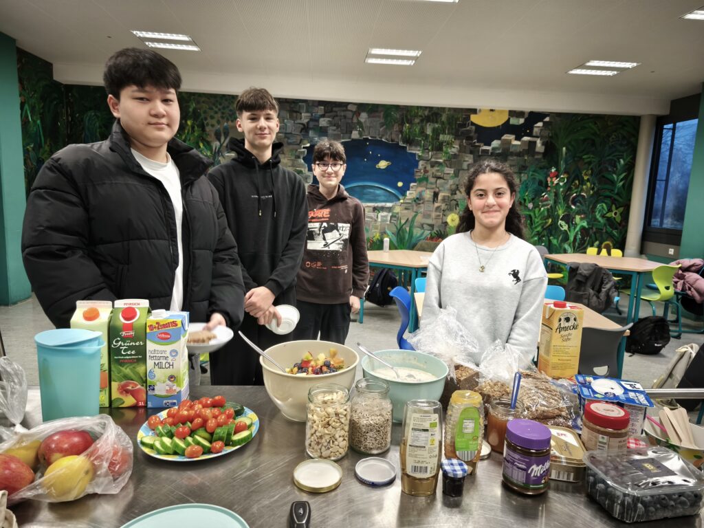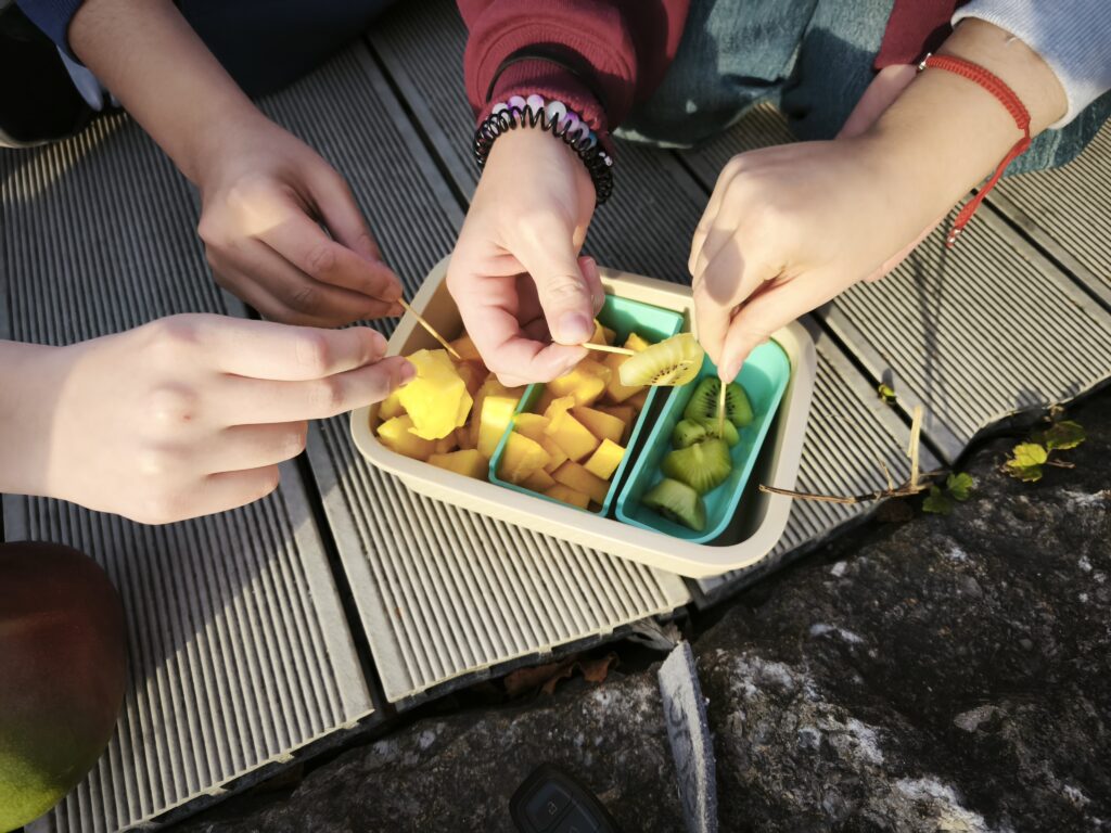 So kam die Idee auf donnerstags während der Hausaufgabenpause einen gesunden Snack draußen zu essen und sich dabei kurz zu bewegen. Die Schüler und Schülerinnen lernten neue Obstsorten kennen wie Mango, Khaki usw. und tranken infused Water mit Ingwer, Zitrone und Minze.